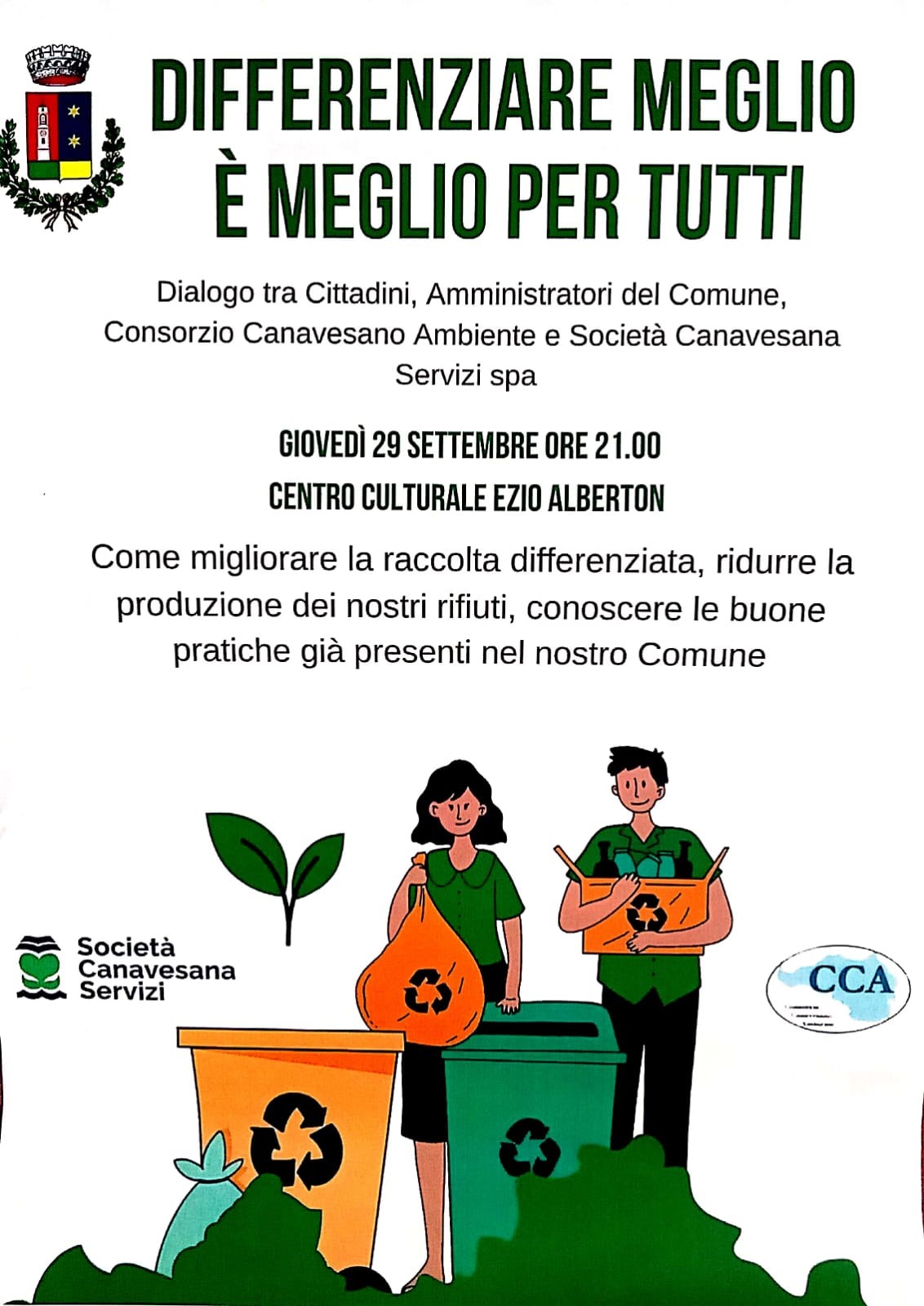 Invito a partecipare all'incontro che si terrà - giovedì 29 settembre 2022 alle ore 21,00 - presso il Centro Culturale Ezio Alberton sulla raccolta differenziata