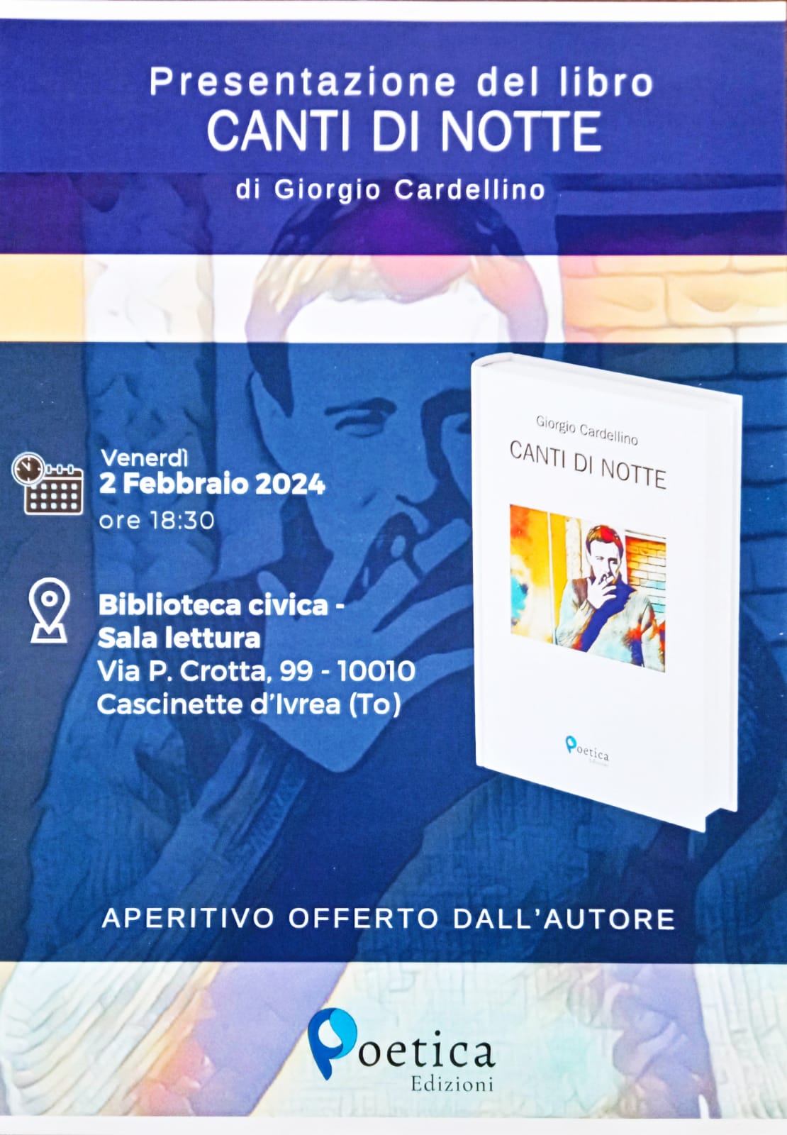 Venerdì 2 febbraio 2024 alle ore 18,30 presso la Sala Lettura, l'autore Giorgio Cardellino presenterà il suo libro "Canti di Notte".