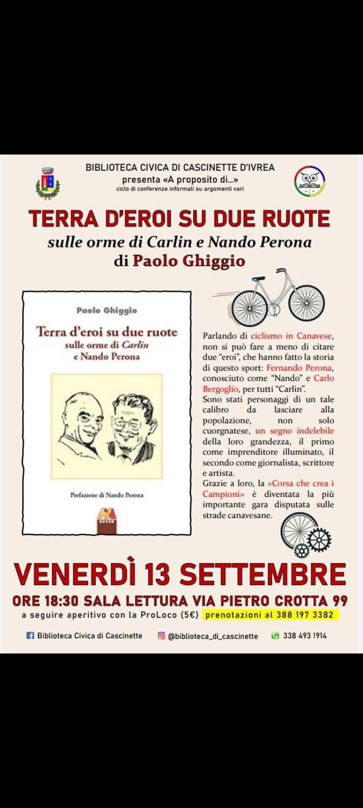 Venerdì 13 settembre 2024 alle ore 18,30 presso la Sala Lettura si terrà l'evento come da locandina allegata.