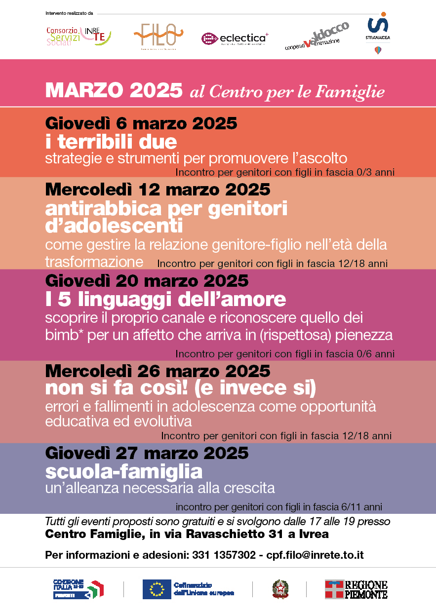Al Centro per le Famiglie F.I.L.O. di Ivrea continuano gli incontri rivolti a genitori con figli in diverse fasce d'età: 0-6 anni, 6-12 anni; 12-18 anni.