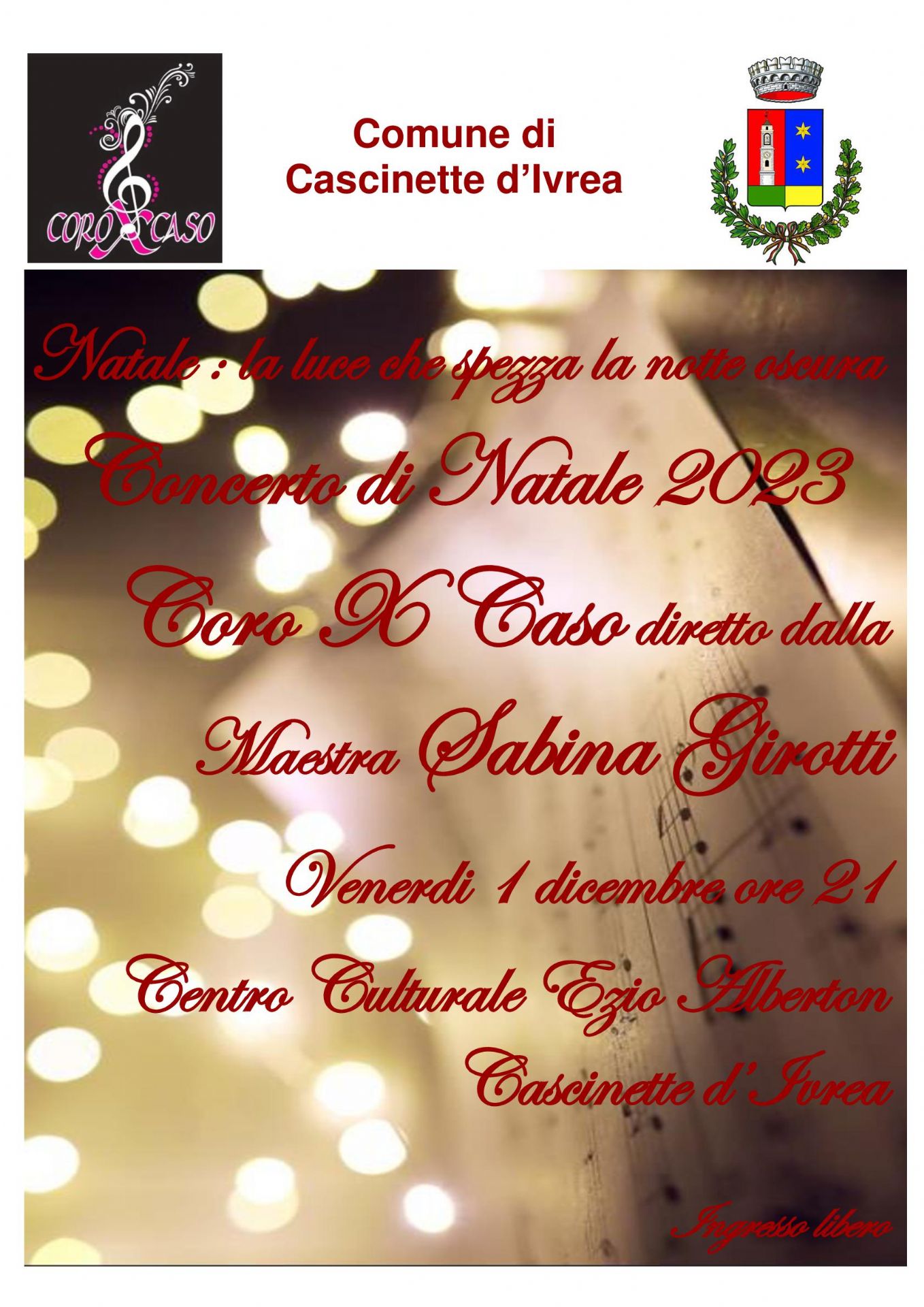 L’Amministrazione Comunale informa tutta la cittadinanza che venerdì 1° dicembre 2023 alle ore 21:00 si terrà presso il Centro Culturale "Ezio Alberton" il Concerto di Natale.