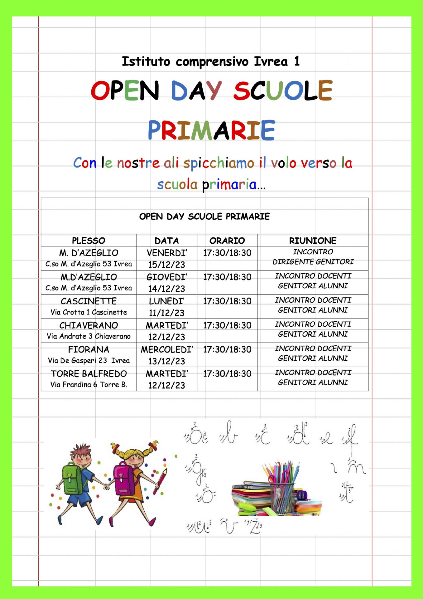 Open day alla Scuola Primaria di Cascinette d'Ivrea lunedì 11 dicembre 2023 alle ore 17,30