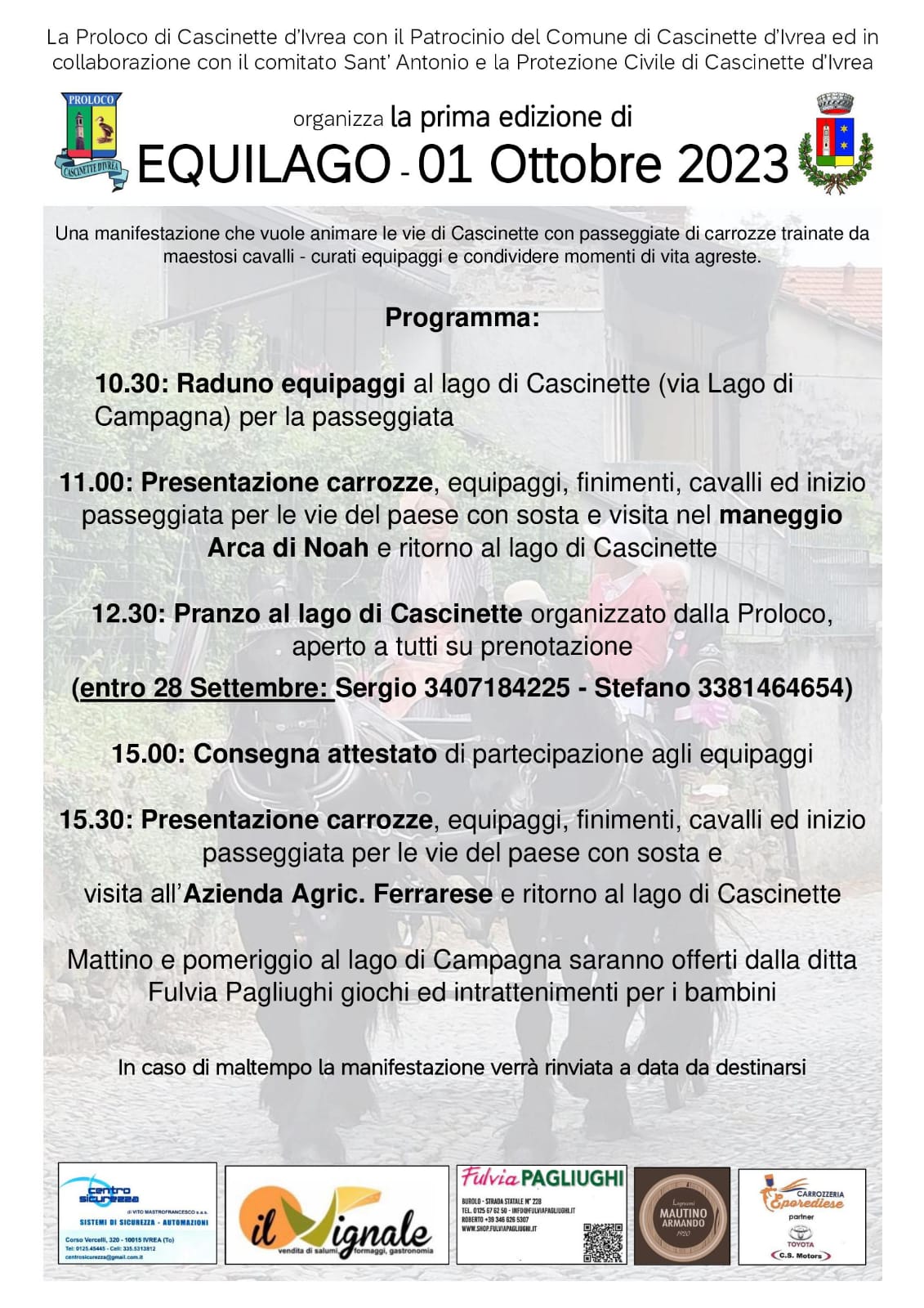 La Proloco di Cascinette d'Ivrea con il Patrocinio del Comune di Cascinette d'Ivrea ed in collaborazione con il Comitato Sant'Antonio e la Protezione Civile di Cascinette d'Ivrea organizza, domenica 1° ottobre 2023, la prima edizione della Manifestazione "Equilago".