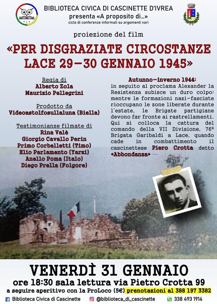 Si comunica che presso la Sala lettura venerdì 31 gennaio 2025 alle ore 18,30 ci sarà la proiezione del Film "Per disgraziate circostanze - Lace 29-30 gennaio 1945"
