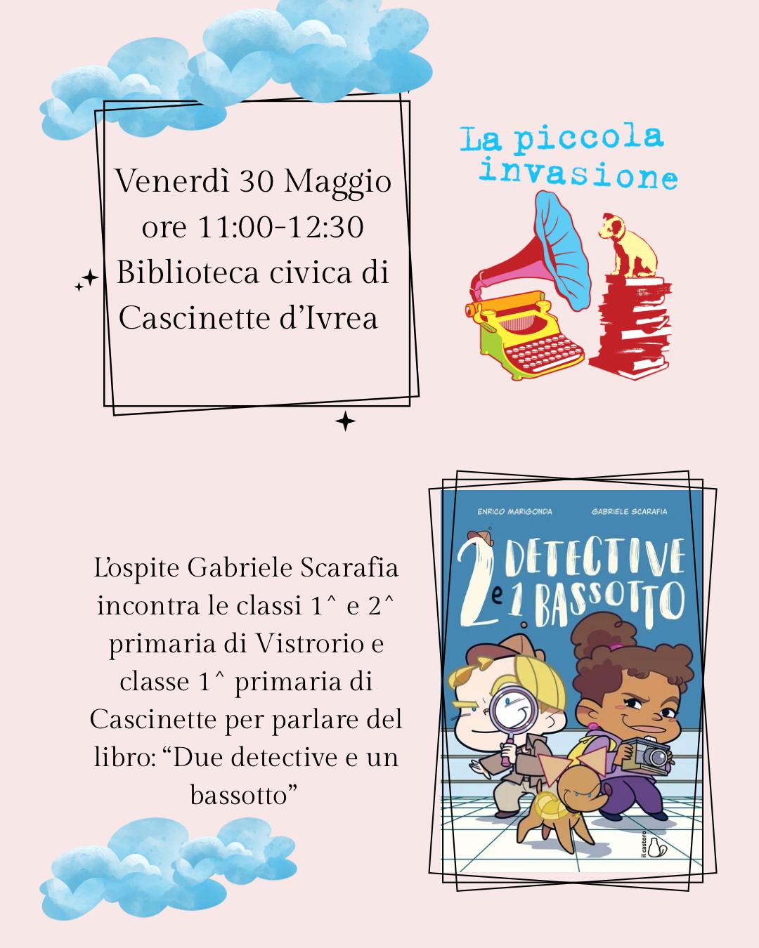 Venerdì 30 maggio 2025 tra le ore 11.00 e 12.30 c/o la Sala Lettura il Fumettista Gabriele Scarafia incontra le classi 1^ e 2^ della Scuola Primaria di Vistrorio e Cascinette d'Ivrea per parlare del libro "Due detective e un bassotto"